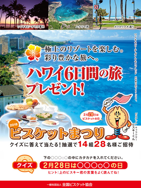 クイズの正解者の中から厳正なる抽選の上、「ハワイ6日間の旅」に当選された方には直接ご連絡いたします。