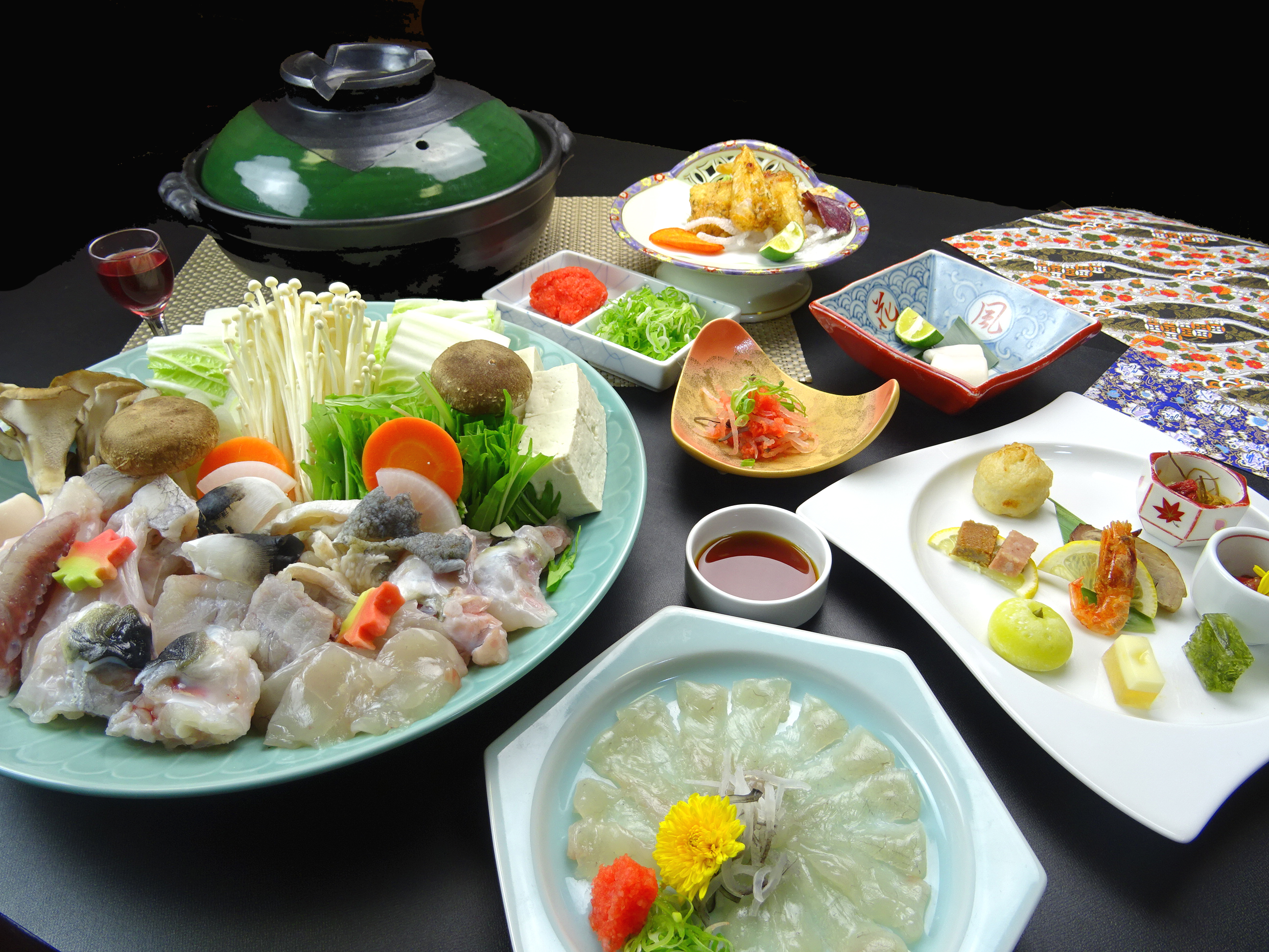 料理はフグ・カニが一度に楽しめる冬の一番人気の会席です。